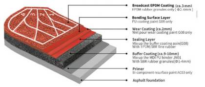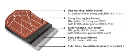 The Sandwich Spray Coat System is a multi-layer approach designed to provide enhanced shock absorption and durability. It consists of a base layer, a cushion layer, and a top spray coat, which offers superior performance and comfort for athletes. This system is ideal for professional sports venues and high-traffic tracks, providing a long-lasting, cushioned surface that reduces the risk of injuries.